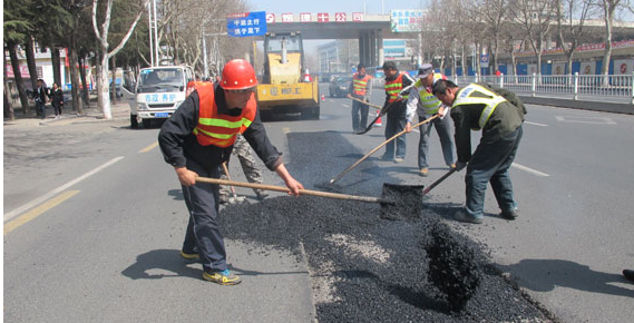 维修方法:对于路面面层破损、龟裂、松散、离析的破坏面积较小的区域(不超过10 m²以上),按照圆洞方补、斜洞正补的原则,切割成规则的形状,然后由人工用风镐将该区域内的上面层沥青全部挖出,然后在其周围及底面上喷洒乳化沥青粘层油PC-3,用量宜为0.3kg—0.6L/㎡,采用细粒式(AC-13)热拌沥青混合料人工摊铺、整平,采用双钢轮压路机沿纵向碾压,第一遍往返静压,第二遍往返振压,以后反复静压,达到密实效果。 若面积较大(超过10 m²以上),则采用铣刨机将破损区域刨铣干净,然后用鼓风机强力清扫。在干净的底面上喷洒乳化沥青粘层油,采用细粒式(AC-13)热拌沥青混合料人工摊铺、整平,采用双钢轮压路机沿纵向碾压,第一遍往返静压,第二遍往返振压,以后反复静压,达到密实效果。 压实完毕后对四周采用热沥青灌缝封口。如果破损区域坑槽较浅(7cm以下),用AC-13沥青混合料一次摊铺和压实,如果破损区域坑槽较深(7cm以上),应将沥青混合料分两次AC-20和AC-13摊铺和压实,AC-13细粒砼层厚度为30mm,AC-20中粒砼层厚度根据实际自定。不论是一次摊铺还是分层摊铺,总摊铺厚度应比原路面高出0.5-0.8cm为宜。